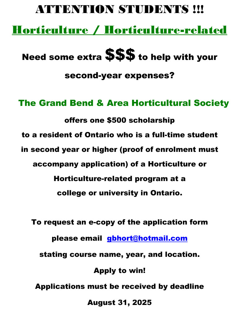 $500 scholarship to an Ontario resident enrolled full time in a Horticulture-related program at a college or university in Ontario.